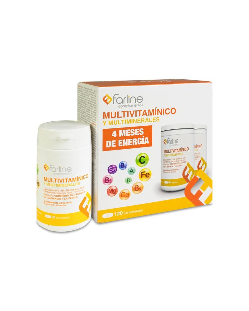 Duplo Farline Multivitamínico es un complemento alimenticio, rico en vitaminas y minerales, dirigido a aportar más energía, lo que contrarresta la sensación de cansancio y fatiga. Específicamente, para ayudar a disminuir el cansancio y la fatiga contiene vitamina C, B6, B12, riboflavina, ácido pantoténico, niacina, ácido fólico (folatos) y magnesio. Además, contiene los siguientes minerales: calcio, fósforo, magnesio, zinc, cobre, manganeso, molibdeno, selenio y cromo. Por su parte, la riboflavina y la vitamina B12 contribuye al mantenimiento y formación de los glóbulos rojos en condiciones normales. Y, el ácido pantoténico además de ayudar a disminuir el cansancio y la fatiga, también contribuye al rendimiento intelectual normal.