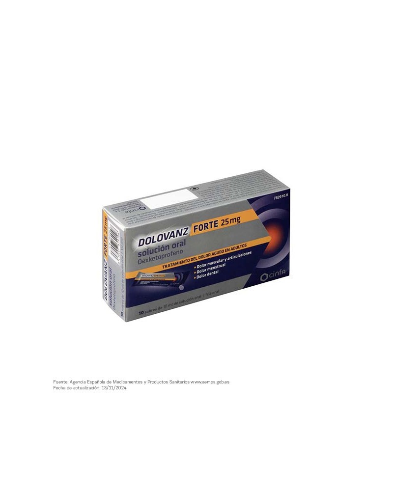 Dolovanz Forte sobres es un medicamento cuyo principio activo es dexketoprofeno. Analgésico perteneciente al grupo de medicamentos denominados antiinflamatorios no esteroideos o AINEs.